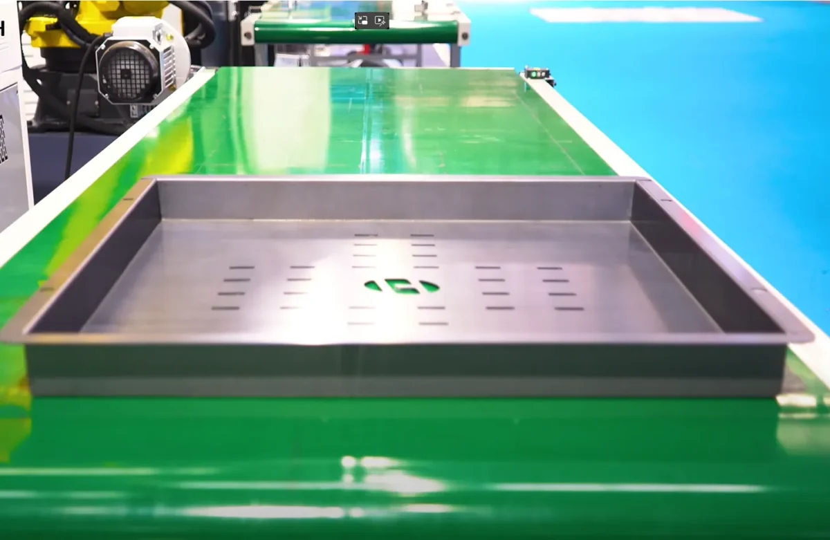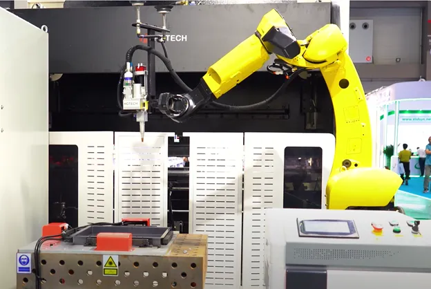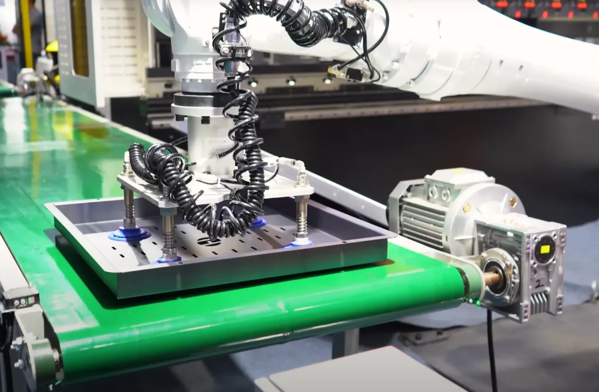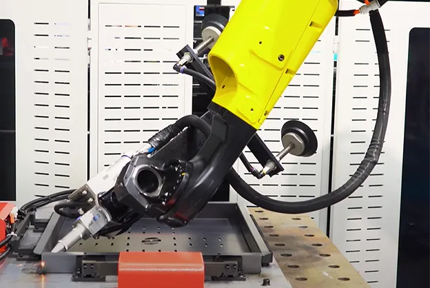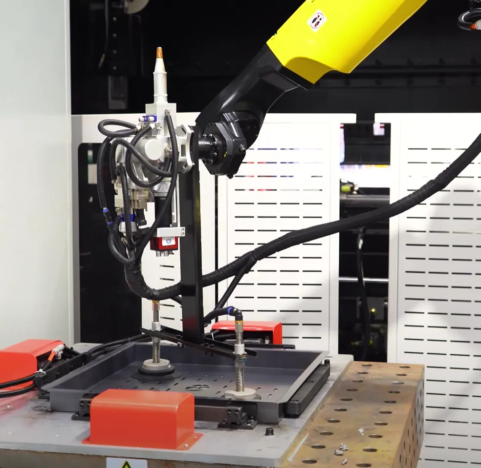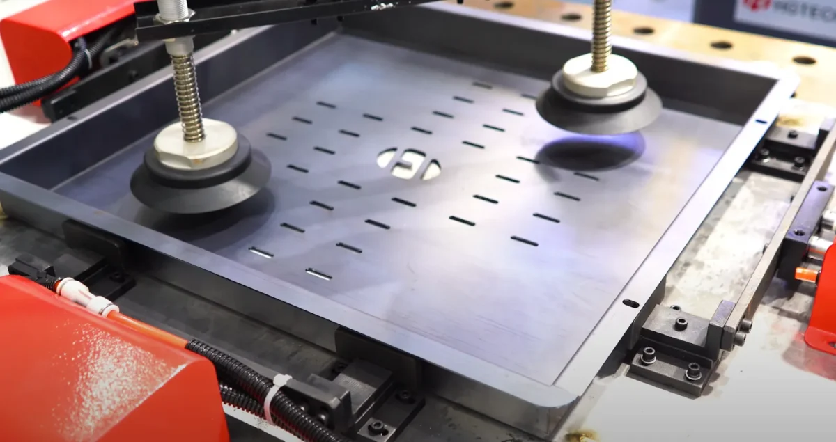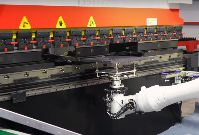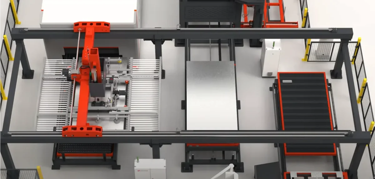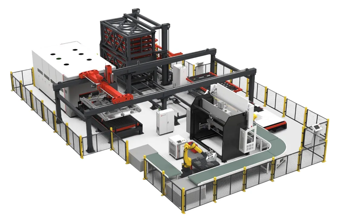 Линия обработки HGTECH Smart-HCL полностью автоматизирует производство изделий из листового металла. Система обеспечивает процессы лазерной резки, гибки, сварки, автопогрузки и хранения.