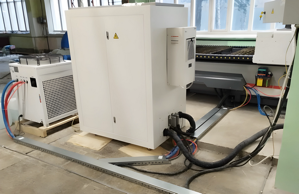 На территории завода наши инженеры проверили и собрали оборудование. Развели провода, подключили питание, управление и газоснабжение. Затем станок откалибровали и настроили параметры реза.