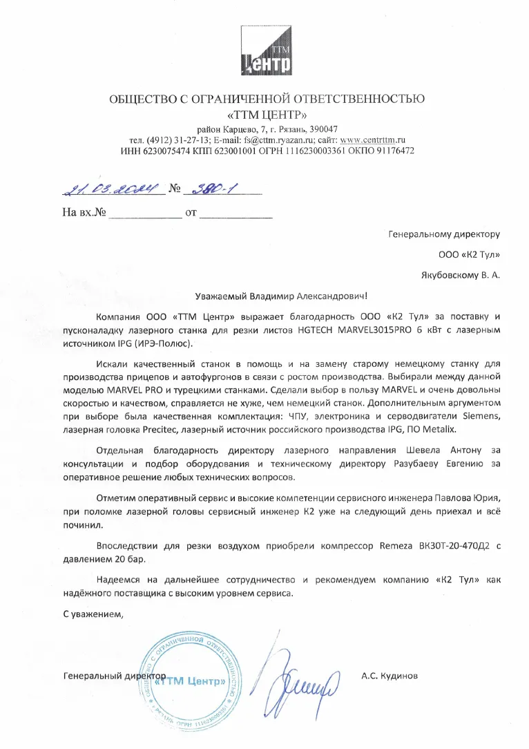 Заказчик был приятно удивлен количеству перечисленных возможностей и функций станка, и требовал как можно быстрее осуществить доставку. Вдобавок был приобретен компрессор Remeza ВК 30Т-20-470Д2 в 20 бар для раскрытия потенциала резки воздухом. Полный комплект был доставлен в в установленный срок на территорию производства компании «ТТМ Центр».