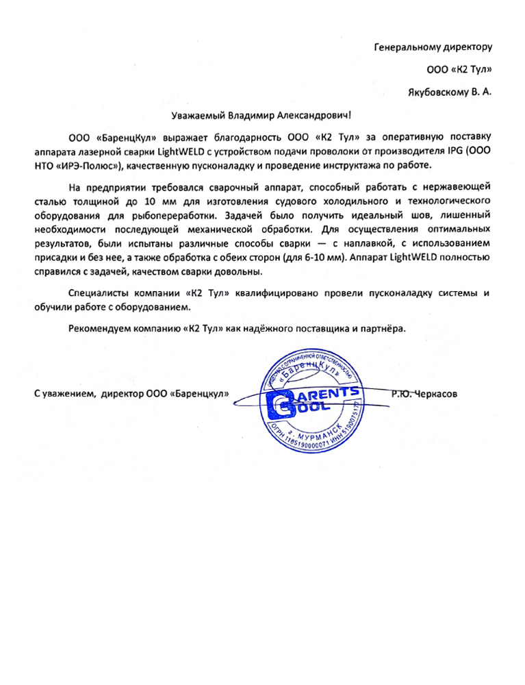 На предприятии Баренцкул была выполнена успешная пусконаладочная работа командой К2 Тул. Заказчику требовался сварочный аппарат, способный работать с нержавеющей сталью толщиной до 10 мм, оставляющий идеальный шов, лишенный необходимости механической обработки. Для достижения цели, на территории предприятия был испытан аппарат лазерной сварки LightWELD с устройством подачи проволоки.